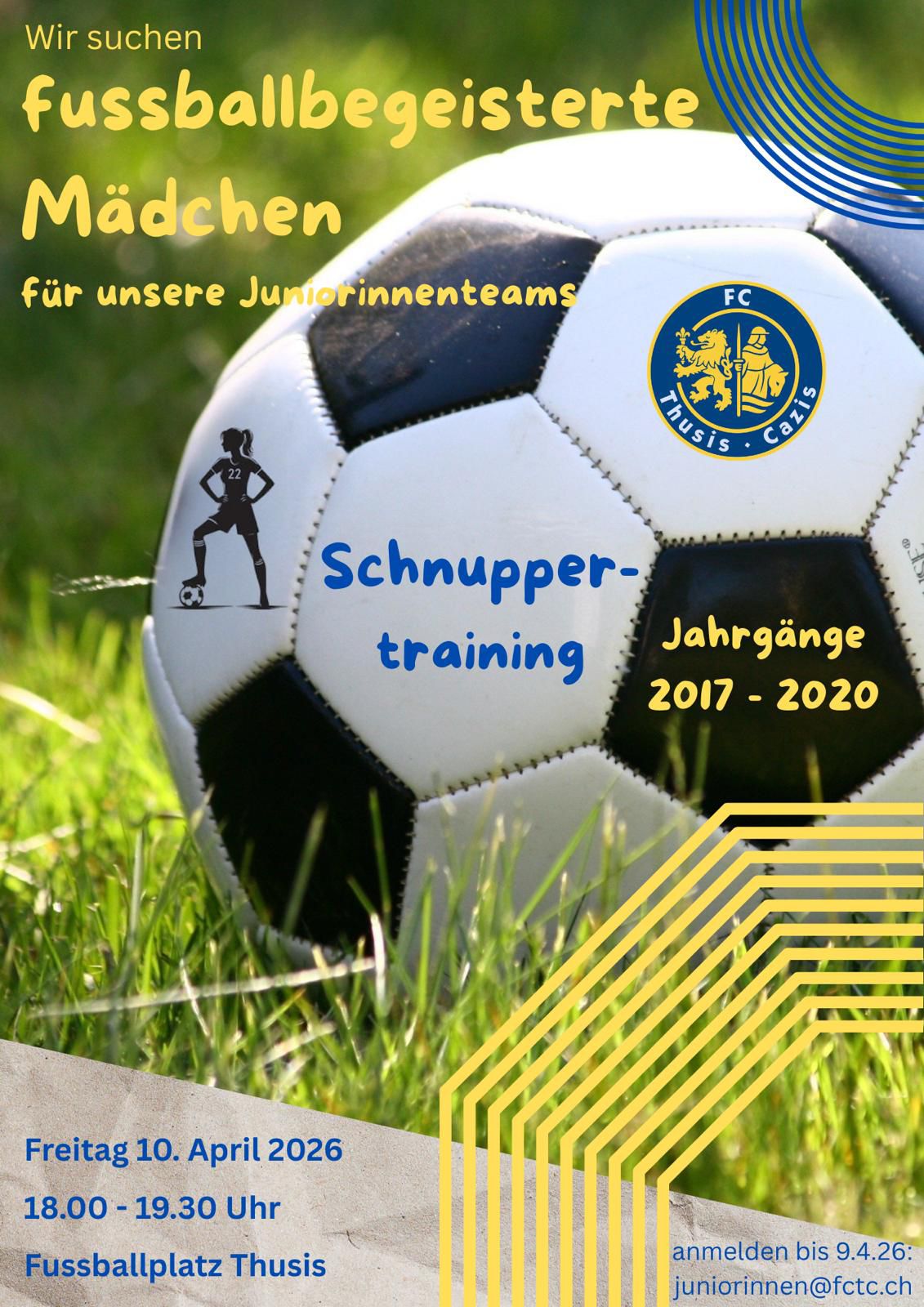 Wir suchen fussballbegeisterte Mädchen! Komm an unser Schnuppertraining für Mädchen mit den Jahrgängen 2017–2020.